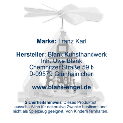 Auf dem Drehteller dieser Weihnachtspyramide umrunden die heiligen drei Könige mit ihren Gaben Maria, Josef und das Jesukind und werden dabei von einem Hirten begleitet. Die Szene spielt in einem Fachwerkhäuschen, an dessen Dachfirst ein goldener Stern strahlt. Die Weihnachtspyramide und die Figuren sind vollständig in Naturtönen gehalten. Sie wird mit vier Teelichten betrieben. Die Weihnachtspyramide wird in Grünhainichen bei BLANK Kunsthandwerk hergestellt.