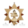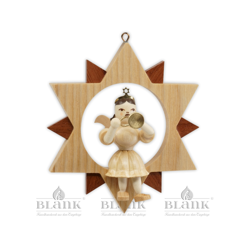 This enchanting little Angel with pleated skirt with a golden star diadem sits happily on a two-tone star and plays lovely melodies on his trumpet. The joy is written on his face. The work of art was handcrafted in our angel workshop and consists of light and dark natural wood. The star has a metal eyelet at the top so that it can be hung with a ribbon. The details of the lovely angel in the star are lavishly designed. Decorate your Christmas tree with this filigree work of art from the German Erzgebirge region or hang the figure in your window as a decoration.