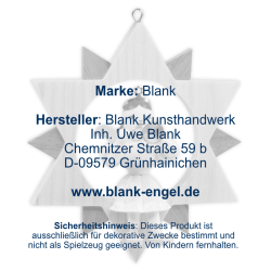 BLANK Kunsthandwerk is a traditional family business from Grünhainichen in the German Erzgebirge, which has been producing filigree angels with pleated skirts and high-quality Christmas decorations since 1955. In addition to pyramids, candle arches, nutcrackers and smoke figures, flower children and Easter bunnies are also elaborately handcrafted. For this purpose, the manufacturer's products have been approved by the Association of Erzgebirgischer Kunsthandwerker und Spielzeughersteller e. V. and awarded with the certificate "Echt Erzgebirge. Holzkunst mit Herz®".