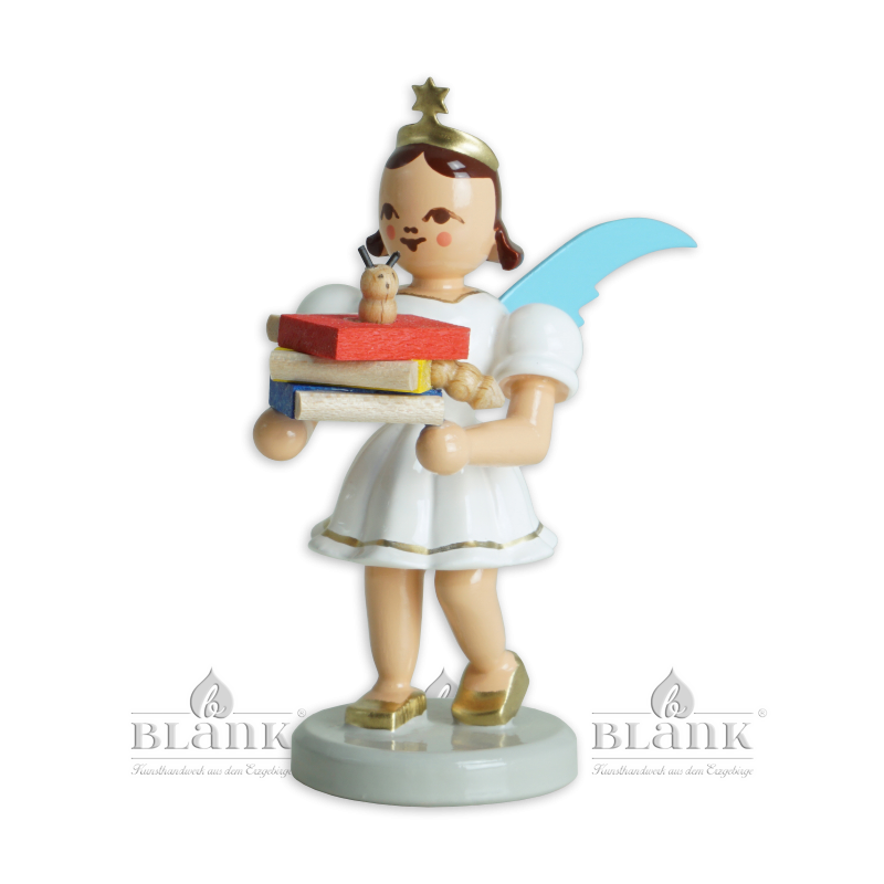 Joyfully entering our field of vision, this enchanting Angel with Pleated Skirt, adorned in vibrant colours, emerges as a book lover and bookworm. Standing at approximately 7 cm in height, this handcrafted and masterfully hand-painted angel captivates not only collectors of Erzgebirge craftsmanship but also book enthusiasts alike. In its arms, the angel carries colourful books, from which a playful bookworm curiously peeks out. The bold colours of the book stack and the detail-oriented design make this figurine a unique eye-catcher and an ideal gift for those who appreciate the extraordinary. "Echt Erzgebirge. Holzkunst mit Herz"®.