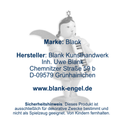 BLANK Kunsthandwerk is a traditional family business from Grünhainichen in the German Erzgebirge, which has been producing filigree angels with pleated skirts and high-quality Christmas decorations since 1955. In addition to pyramids, candle arches, nutcrackers and smoke figures, flower children and Easter bunnies are also elaborately handcrafted. For this purpose, the manufacturer's products have been approved by the Association of Erzgebirgischer Kunsthandwerker und Spielzeughersteller e. V. and awarded with the certificate "Echt Erzgebirge. Holzkunst mit Herz®".