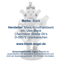 BLANK Kunsthandwerk is a traditional family business from Grünhainichen in the German Erzgebirge, which has been producing filigree angels with pleated skirts and high-quality Christmas decorations since 1955. In addition to pyramids, candle arches, nutcrackers and smoke figures, flower children and Easter bunnies are also elaborately handcrafted. For this purpose, the manufacturer's products have been approved by the Association of Erzgebirgischer Kunsthandwerker und Spielzeughersteller e. V. and awarded with the certificate "Echt Erzgebirge. Holzkunst mit Herz®".