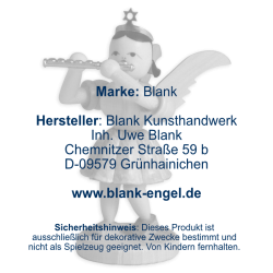 BLANK Kunsthandwerk is a traditional family business from Grünhainichen in the German Erzgebirge, which has been producing filigree angels with pleated skirts and high-quality Christmas decorations since 1955. In addition to pyramids, candle arches, nutcrackers and smoke figures, flower children and Easter bunnies are also elaborately handcrafted. For this purpose, the manufacturer's products have been approved by the Association of Erzgebirgischer Kunsthandwerker und Spielzeughersteller e. V. and awarded with the certificate "Echt Erzgebirge. Holzkunst mit Herz®".