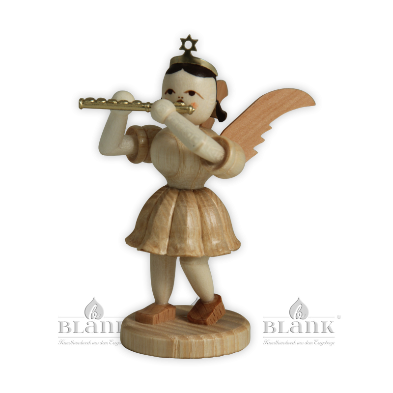 This short skirt angel with the unique pleated skirt by BLANK Kunsthandwerk plays a detailed golden piccolo. It accompanies the large orchestra of angels, which is elaborately handcrafted in our angel workshop in the Erzgebirge. The natural-coloured figure is made of various local woods and is assembled in approx. 135 work steps with great attention to detail. Painters finally give the angel a friendly expression so that it can enchant everyone alone, or in an ensemble.