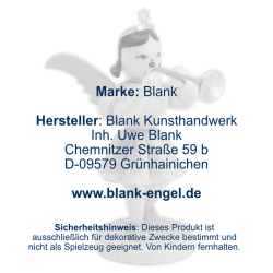BLANK Kunsthandwerk is a traditional family business from Grünhainichen in the German Erzgebirge, which has been producing filigree angels with pleated skirts and high-quality Christmas decorations since 1955. In addition to pyramids, candle arches, nutcrackers and smoke figures, flower children and Easter bunnies are also elaborately handcrafted. For this purpose, the manufacturer's products have been approved by the Association of Erzgebirgischer Kunsthandwerker und Spielzeughersteller e. V. and awarded with the certificate "Echt Erzgebirge. Holzkunst mit Herz®".