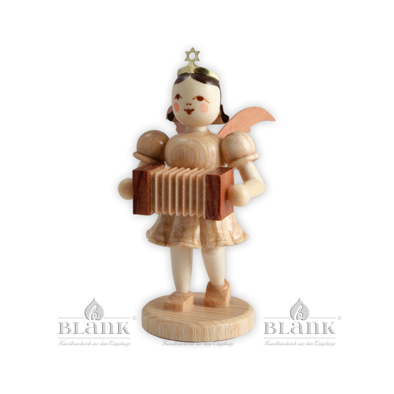 This little angel with the unique pleated skirt from BLANK Kunsthandwerk plays dreamily on a small concertina. He accompanies the large angel orchestra, which is elaborately handcrafted in our angel workshop in the Erzgebirge. The natural-coloured figure is made from various local woods and is put together in approx. 135 steps with great attention to detail. Finally, painters give the angel a friendly expression so that he can enchant everyone alone or in an ensemble.