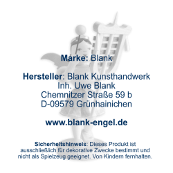 BLANK Kunsthandwerk is a traditional family business from Grünhainichen in the German Erzgebirge, which has been producing filigree angels with pleated skirts and high-quality Christmas decorations since 1955. In addition to pyramids, candle arches, nutcrackers and smoke figures, flower children and Easter bunnies are also elaborately handcrafted. For this purpose, the manufacturer's products have been approved by the Association of Erzgebirgischer Kunsthandwerker und Spielzeughersteller e. V. and awarded with the certificate "Echt Erzgebirge. Holzkunst mit Herz®".