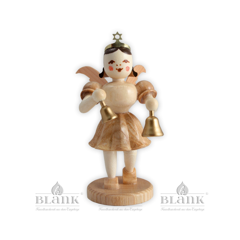 This little angel with the unique pleated skirt from BLANK Kunsthandwerk holds fine golden bells in his hands. He accompanies the large angel orchestra, which is elaborately handcrafted in our angel workshop in the Erzgebirge. The natural-coloured figure is made from various local woods and is put together in approx. 135 steps with great attention to detail. Finally, painters give the angel a friendly expression so that he can enchant everyone alone or in an ensemble.