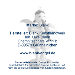 BLANK Kunsthandwerk is a traditional family business from Grünhainichen in the German Erzgebirge, which has been producing filigree angels with pleated skirts and high-quality Christmas decorations since 1955. In addition to pyramids, candle arches, nutcrackers and smoke figures, flower children and Easter bunnies are also elaborately handcrafted. For this purpose, the manufacturer's products have been approved by the Association of Erzgebirgischer Kunsthandwerker und Spielzeughersteller e. V. and awarded with the certificate "Echt Erzgebirge. Holzkunst mit Herz®".