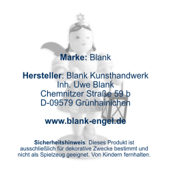 BLANK Kunsthandwerk is a traditional family business from Grünhainichen in the German Erzgebirge, which has been producing filigree angels with pleated skirts and high-quality Christmas decorations since 1955. In addition to pyramids, candle arches, nutcrackers and smoke figures, flower children and Easter bunnies are also elaborately handcrafted. For this purpose, the manufacturer's products have been approved by the Association of Erzgebirgischer Kunsthandwerker und Spielzeughersteller e. V. and awarded with the certificate "Echt Erzgebirge. Holzkunst mit Herz®".