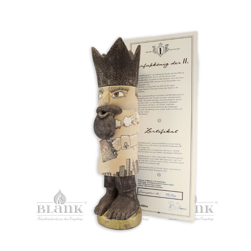 After the great success of the “Barefoot King” in 2011, we decided, together with the artist Rolf Büttner, to launch another series in 2012: Like the previous Barefoot King, this one was created from a combination of traditional and new elements. The body belongs to a nutcracker, but Barefoot King II is an incense smoker. Barefoot, with a crown and a lush beard, he combines many characters in one person. He is a grim smoker, high king and little boy at the same time. There is something of this figure in each of us. Each of the 100 strictly limited figures has an individual drawing of Rolf Büttner and a certificate. Barefoot King II is always different - one like the other.