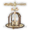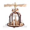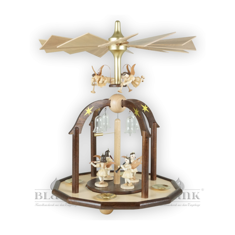 Seven pleated robed angels decorate this artistic pyramid from the German Erzgebirge. Four angels play music on the base plate, three more angels hover under the wing wheel and play heavenly trombone sounds. Lovely details, such as the instruments of the enchanting pleated robed angels with carefully manufactured wings, make this Christmas art work from our workshops in Grünhainichen distinctive. The dark brown colors of the dome and the base plate create an effective contrast to the clear wood of the wing wheel and the floor plate with the candle holders. Decent golden colours complete the overall picture. The amazing pyramid is operated by four pyramid candles – four little bells of glass ring melodically during Christmas season. This art work was manufactured by hand and is certified "echt Erzgebirge" (genuinely made in the Ore Mountains). Let the small pleated robed angels on the pyramid and the quiet sound of the bells enchant you!