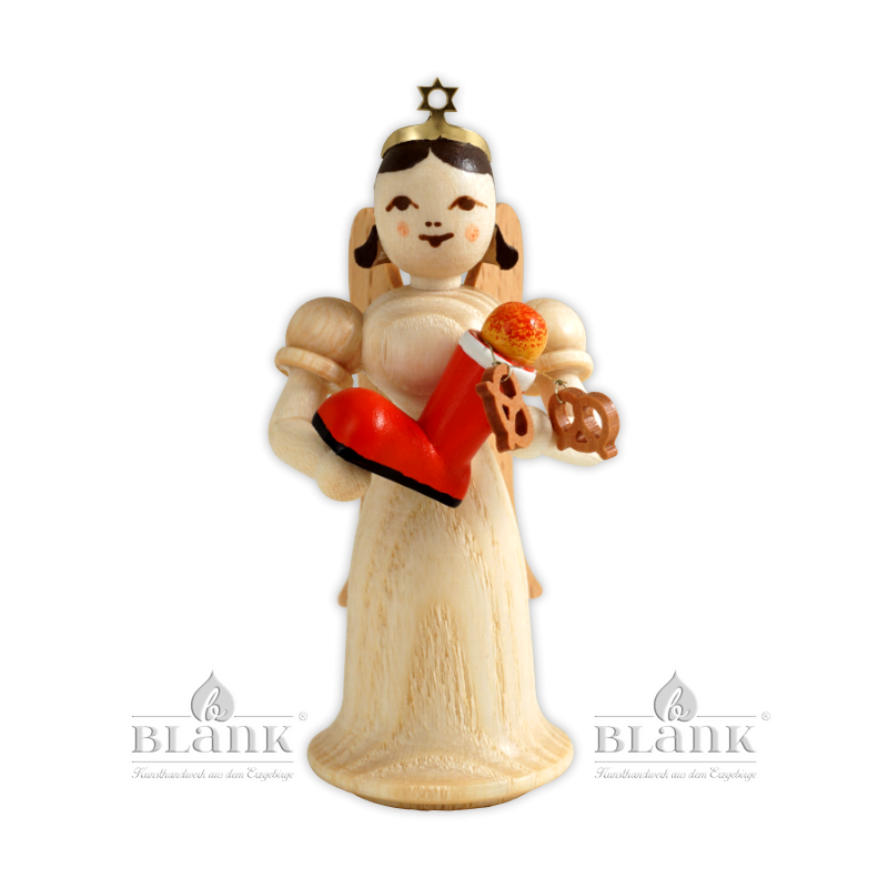 Figure of the group "Christmas Dream", which is a special edition for those retail shops, who are members of "Fachhandelsring Erzgebirgische Volkskunst®". This little long-robed angel with a bell-shaped skirt made of natural wood seems very excited: in his hands he is carrying a bright red, bulging Santa Claus boot, from which a crunchy apple and fine gingerbread pretzels protrude. The angel is lovingly handcrafted and delicately decorated in our angel workshops. It is a real original of the finest Erzgebirge craftsmanship - "Echt Erzgebirge. Holzkunst mit Herz®".