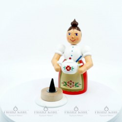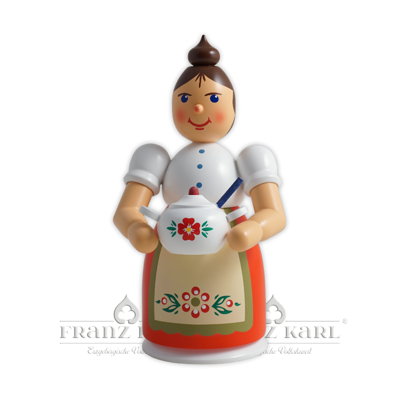 This friendly smoker has just come out of the kitchen. In her hands she is carrying a white terrine with a flower motif and steaming (!) content, probably made by herself, because she shines all over her face. The proper cook wears an apron decorated with flowers, which contrasts discreetly with her red skirt and goes well with the white blouse. The figure is lovingly handcrafted and is not only an appealing decoration at Christmas time.