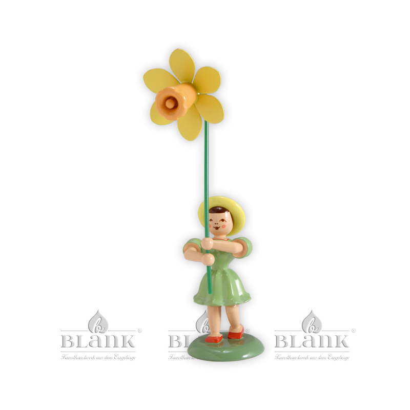 The figure carries a lovingly crafted daffodil which was created with great attention to detail in our workshops in Grünhainichen. Enjoy this little flower child or give it away for everlasting flower greetings.