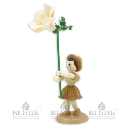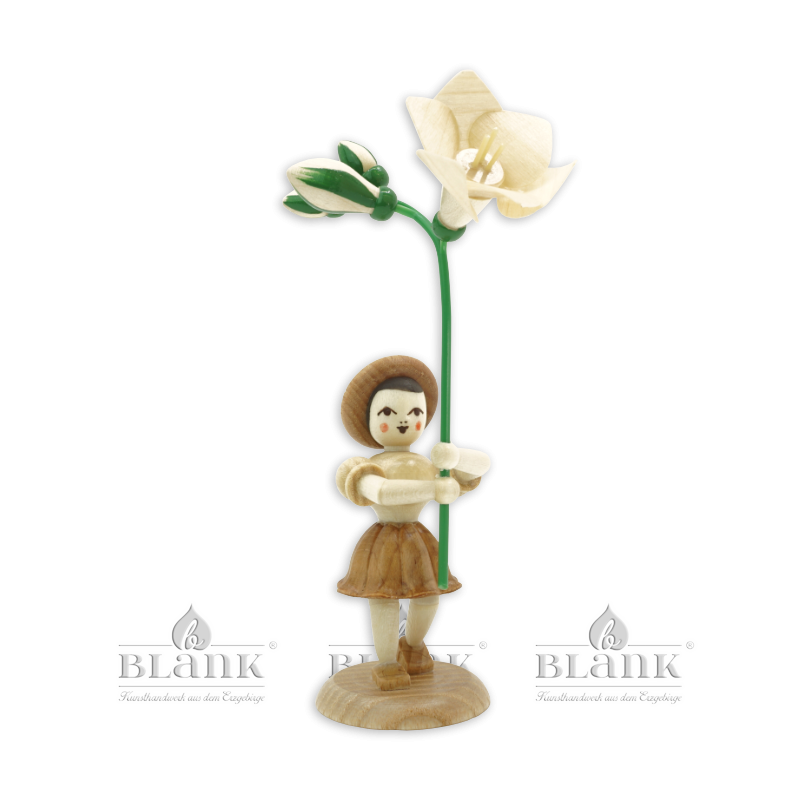 The smiling flower child with freesia pleases the eye of every flower lover: it holds a long, elegant stem in its hands, on which a magnificent funnel-shaped freesia flower and several delicate buds nestle. The clearly lacquered wooden figure is optically enlivened by the interplay of the natural wood colours and its grain and spreads a good mood not only in spring. "Echt Erzgebirge. Holzkunst mit Herz®".