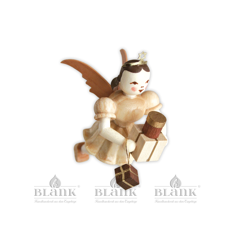 This little hanging angel looks down at his music-making friends from above. Securely attached to a golden ribbon, it accompanies the large angel orchestra from lofty heights. The natural-coloured figure with a short pleated skirt has both hands full of finely decorated gifts. Whether as a tree ornament, gift tag, living room decoration or "small souvenir" - the hanging angels with pleated skirts from BLANK are real originals of the Erzgebirge handicrafts and will enchant everyone. The figures are made entirely by hand from local woods and inspire with their uniqueness. Thanks to the differently grained woods, each piece is unique.