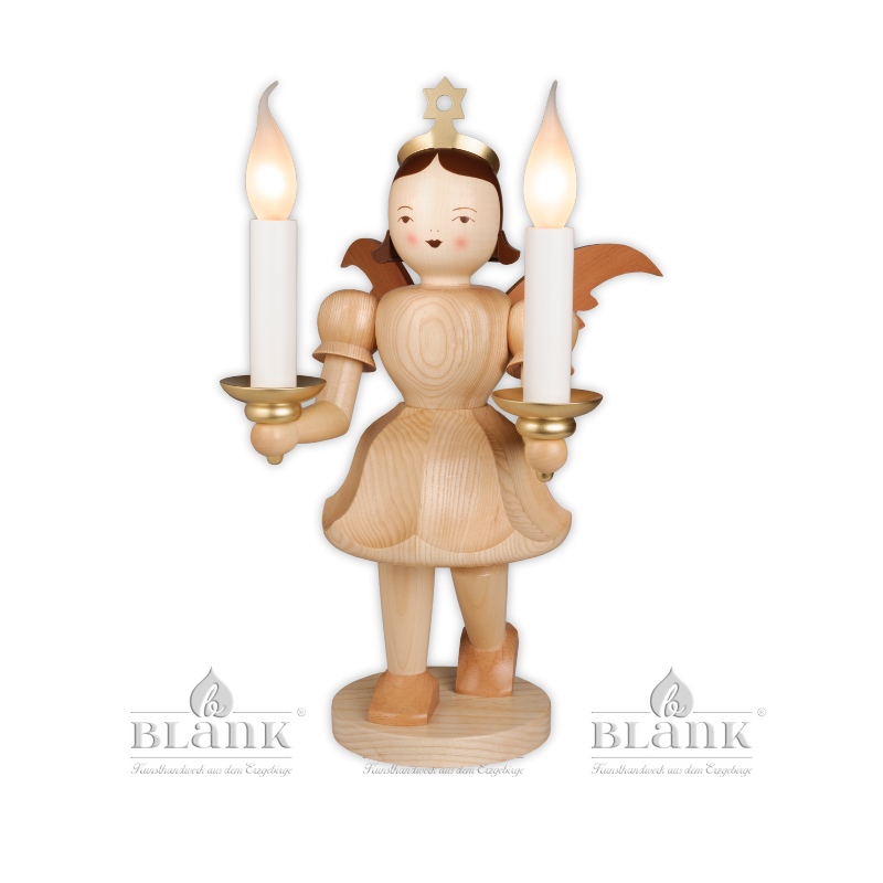 The 50 cm (19.69 inches) high angel with a pleated robe and electric lighting, illuminates the dark season. In its hands, it carries two electric candles. The angel with the dark hair and a tiara with a star on its head, was elaborately crafted by hand of clear natural wood and therefore it may count as certified "echt Erzgebirge" (genuinely made in the Ore Mountains). Our pleated robed angel will surely spread a Christmas atmosphere in your home.