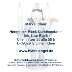 BLANK Kunsthandwerk is a traditional family business from Grünhainichen in the German Erzgebirge, which has been producing filigree angels with pleated skirts and high-quality Christmas decorations since 1955. In addition to pyramids, candle arches, nutcrackers and smoke figures, flower children and Easter bunnies are also elaborately handcrafted. For this purpose, the manufacturer's products have been approved by the Association of Erzgebirgischer Kunsthandwerker und Spielzeughersteller e. V. and awarded with the certificate "Echt Erzgebirge. Holzkunst mit Herz®".