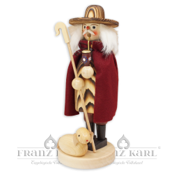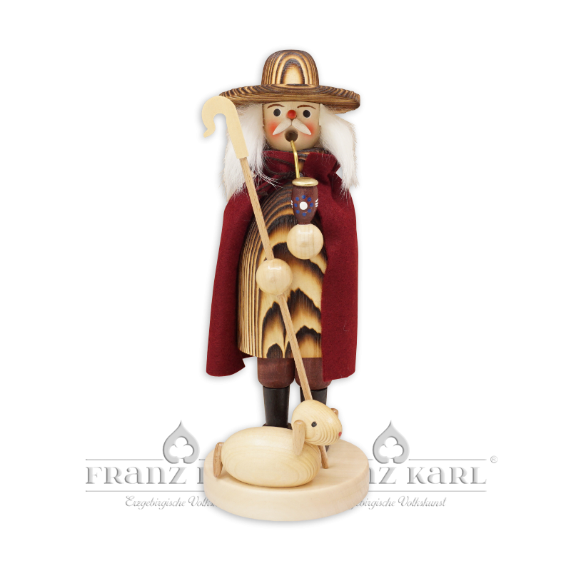 The classic design of this sanded Incense Smoker offers an extraordinary surface finish. In a special manufacturing process, the spruce bodies are first burned completely black and then processed with wire brushes to expose the individual wood grain. The method of "sanding" requires a lot of tact and creates unique evidence of Erzgebirge craftsmanship tradition. This Shepherd wears a warm and soft felt cape for the cold weather. He has a nicely decorated pipe and a huge shepherd's hat. „Echt Erzgebirge, Holzkunst mit Herz®“ (Original from the Erzgebirge, Wooden Art with Soul)